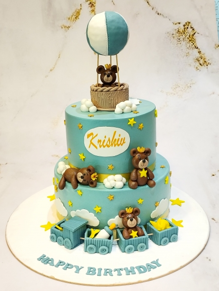 This delightful cake features a charming theme combining teddy bears, hot air balloons, and toy trains. the cake is adorned with cute, edible teddy bear figurines, some sitting and some holding colorful balloons. whimsical hot air balloons made of fondant or icing float above, adding a sense of adventure. a toy train, complete with tiny carriages, circles the base of the cake, creating a playful and nostalgic scene. the cake is beautifully detailed, with vibrant colors and intricate designs, perfect for a child's birthday or any fun celebration.