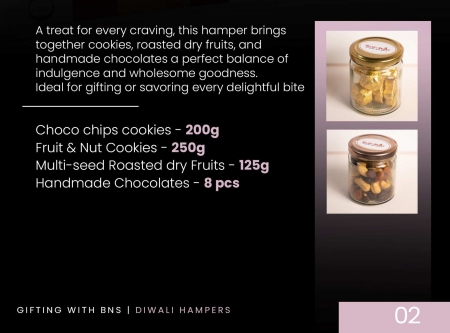 Gift pack with premium cookies ,includes 250 grams fruit cookies , 200 grams, choco chip cookies , multi-seed roasted dry fruits - 125g & handmade chocolate - 8 pcs.